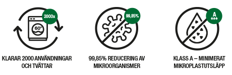 Tvättkostnaden per mopp är också liten. Tvättas separat i temperatur mellan 30–90°C. Ur miljösynpunkt, tvätta mellan 30–60°C.