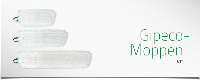 Gipeco-Moppen klarar 1000 användningar och tvättar vid tvätt i 60 °C förutsatt att tvättråden följs samt att Gipeco-Moppstativ används. Krymper < 6% vid tvätt. Moppen kan användas på alla typer av ytor.