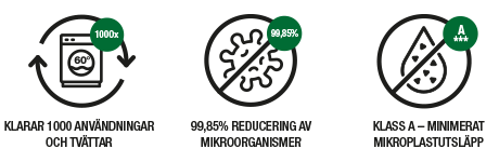 Tvättkostnaden per mopp är också liten. Tvättas separat i temperatur mellan 30–90°C. Ur miljösynpunkt, tvätta mellan 30–60°C.